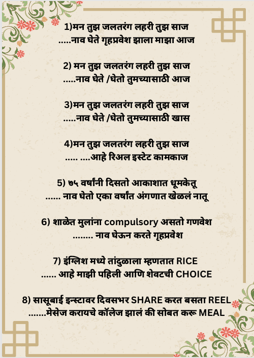 कृपया PDF साठी फॉर्म भरा Name Email Message Intrested in Funny ukhane groom & bride ukhane gruhapravesh haldi kumkum ukhane satyanaryan puja ukhnae download